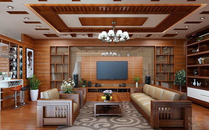 Nội thất phòng khách hiện đại với chất liệu gỗ tự nhiên mang đến vẻ đẹp sang trọng và ấm áp.